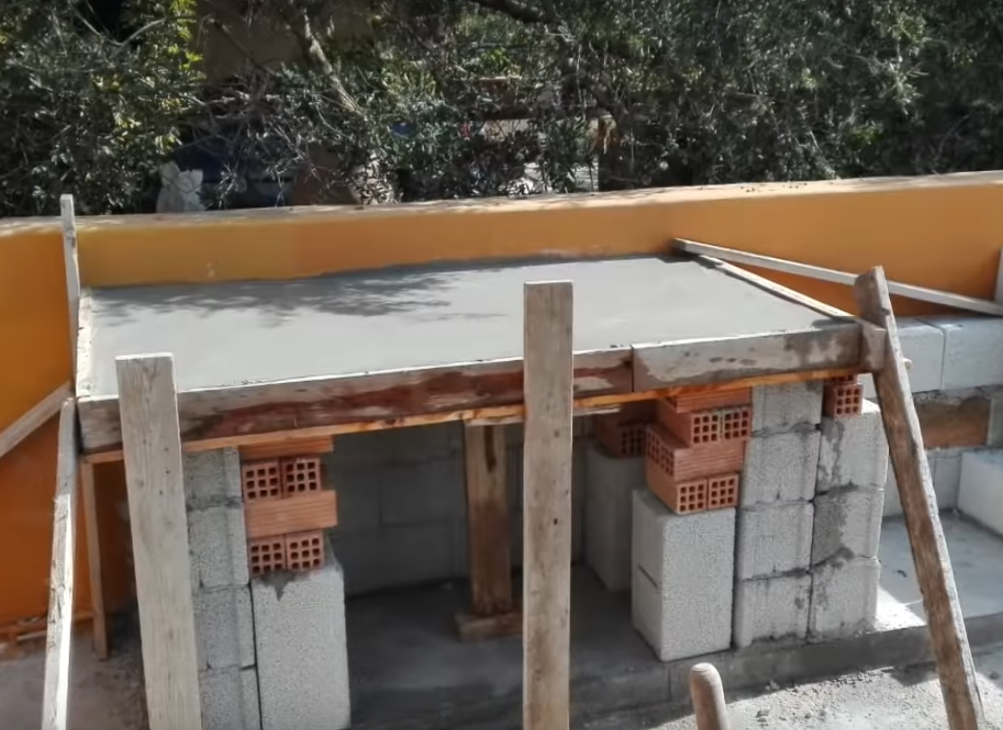 . نرفع القالب عن الخرسانة الإسمنتية مايقارب 15 سم ونضع تحته قطع من الطوب مؤقتاً حتى نستطيع سحب القالب بعد الانتهاء من بناء بيت النار للفرن الحجري.